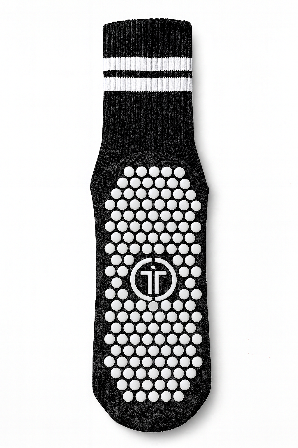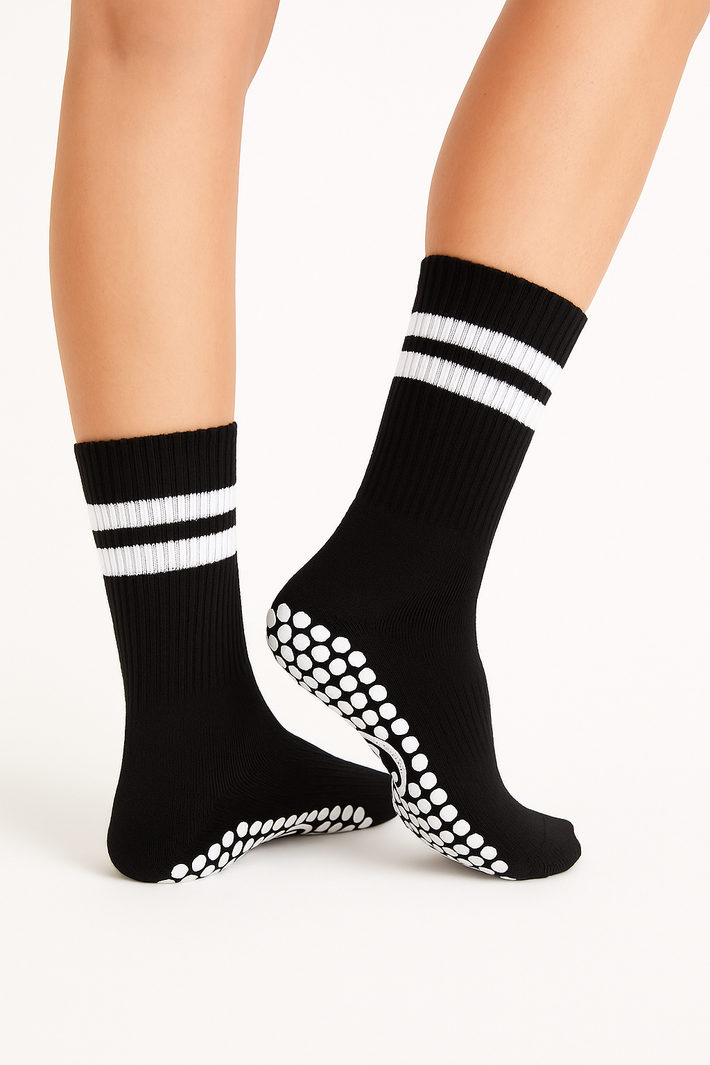 Black Classic Crew with White Stripes Pilates Grip Socks